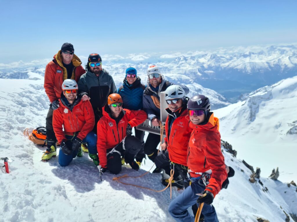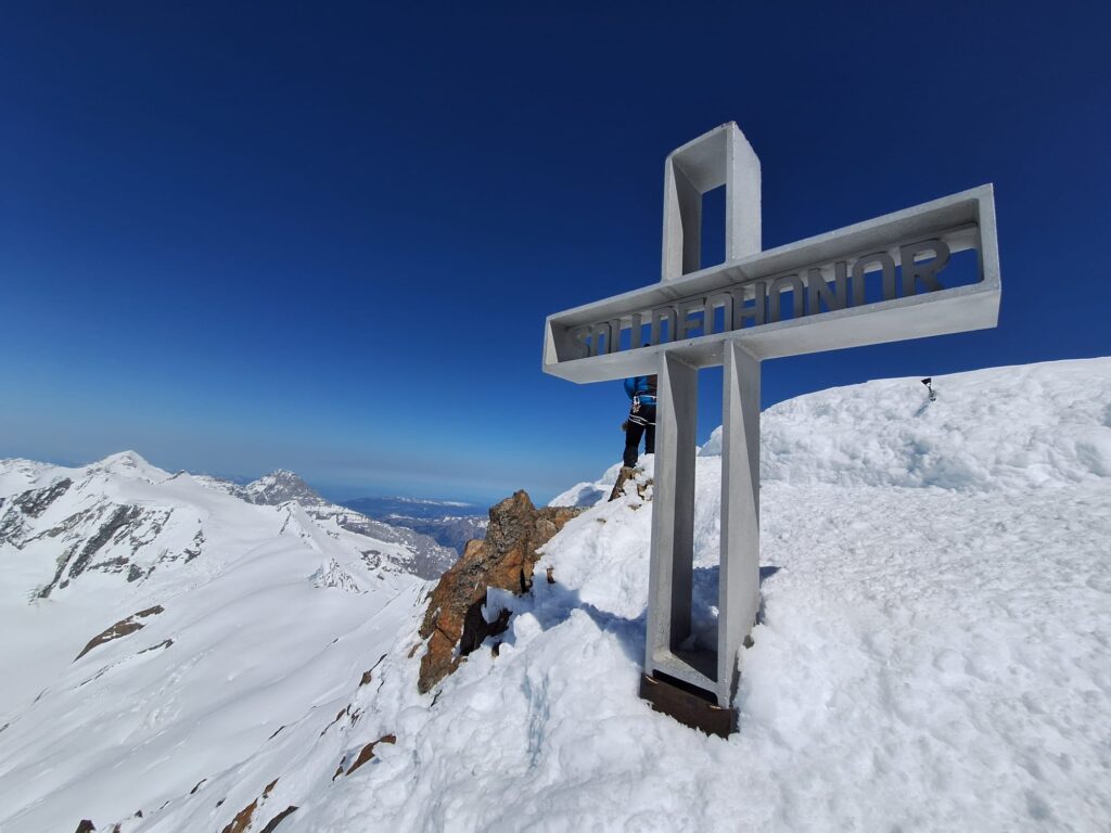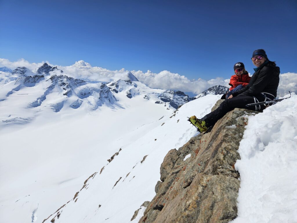 Am zweiten Tag stand das Herzstück unserer Tour auf dem Programm: die Besteigung des Finsterarhorns (4274 m) – dem höchsten Gipfel der Berner Alpen. Wir starteten um 6:00 Uhr von der Hütte aus. Der Aufstieg verlief bei besten Wetter- und Schneeverhältnissen reibungslos, und um die Mittagszeit konnten wir gemeinsam den Gipfelerfolg feiern. Ein unvergesslicher Moment für alle 11 Teilnehmer! Gegen 14:30 Uhr kehrten wir erschöpft, aber glücklich zur Hütte zurück. Den Abend ließen wir bei einem gemütlichen Hüttenabend mit bester Laune und Panoramablick ausklingen.